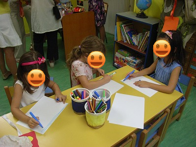 さて、始業式に行くと、子供と父兄で学校はごった返し、収拾が付かない状態です。スピーカーで移動を指示しても、エネルギーをもてあました子供たちは、なかなかまとまりもつかない混沌状態で、あっけに取られました。ギリシャでは、始業式には「アギアスモス(聖水の儀式)」というギリシャ正教の司教様が行う儀式があるのです。学校に、教会が介入しているということが、私には結構驚きでした。ギリシャ正教は、政治的、日常的儀式にも何かと登場します・・・やっぱり、ギリシャの生活の中に溶け込んでいるものなんでしょう。校長先生のお話の後に、黒い服と帽子を身につけた、あごひげの長い司教様のスピーチがあってから、清めた聖水をバジルの葉っぱの束につけて、子供達にふりかけるのです。ちょうど、お相撲さんが、土俵に塩をまく動作に似ています。聖水が高く空を舞い、キラキラと子供たちの頭に降りかかり、歓声があがります。きっと、これが子供たちを守り、前途を祝い、清める御利益があるのでしょう。私もちょっとおこぼれをもらいました。この聖水は、元は水道水らしいですが、これをギリシャ正教の司教様が清める儀式をすると聖水となり、ずっと腐らないそうです。(。。と義父が言っておりましたが、真偽のほどは確かめておりません。)